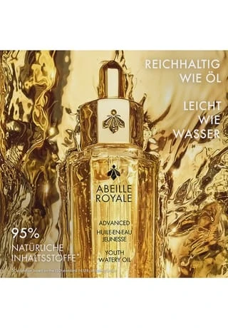 Das Advanced Youth Watery Oil ist aus über 10 Jahren Forschungsarbeit zur reparierenden Wirkung von Honig hervorgegangen. Das hochwirksame Konzentrat bietet der Haut eine neunfach schnellere Reparaturwirkung. Die Haut ist sichtbar aufgepolstert, glatter und strahlender. Schon nach 8 Std. ist die Erholung vollendet. Die durch unser einzigartiges Savoir-faire in der Formulierung erreichte Textur bietet überraschenderweise die Reichhaltigkeit eines Öls, die Leichtigkeit einer Lotion und die Kraft eines Serums. Die durch aktive Mikro-Kügelchen angereicherte Formel mit 95% Inhaltsstoffen natürlichen Ursprungs verteilt sich sofort, um die Haut mit Feuchtigkeit zu versorgen, ohne sie zu belasten. In ihrer Dynamic BlackBee Repair-Technologie sind die wirkungsvollsten, von der GUERLAIN-Forschung entdeckten Bienenprodukte vereint: Der außergewöhnliche Honig der schwarzen Bienen von der Insel Ouessant (Bretagne, Frankreich), angereichert mit Honig von 3 weiteren geschützten Inseln (Korsika, Ikaria, Åland) und einem exklusiven Gelée Royale. Die Haut sieht gekräftigt, gesünder und merklich jünger aus. Anwendung morgens und abends auf Gesicht und Hals vor dem Double R Renew & Repair Serum oder der Creme. Flakon vor Gebrauch schütteln.