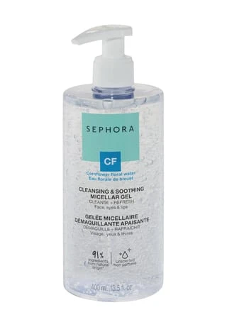 Das unparfümierte Mizellen-Reinigungsgelee aus der Sephora Collection besteht zu 91 % aus Inhaltsstoffen natürlichen Ursprungs und entfernt sanft und effektiv Augen- und Gesichts-Make-up. Die frische, zartschmelzende Textur entfernt Make-up in einem Schritt und sorgt für eine gereinigte und geschmeidige Haut, die sich gut anfühlt. Das Mizellen-Reinigungsgelee mit Kornblumenblütenwasser ist dein bester Verbündeter für eine sanfte Entfernung von Augen- und Gesichts-Make-up. Die frische, zartschmelzende Textur verleiht ein sofortiges geschmeidiges und angenehmes Hautgefühl und sorgt für eine reine Haut. Schon nach der ersten Anwendung fühlt sich die Haut angenehm an, ist beruhigt und geschmeidiger. Ein sanfter Make-up-Entferner für empfindliche Haut, der im Rahmen eines verantwortungsvollen Ansatzes entwickelt wurde. Das Mizellen-Reinigungsgelee aus der SEPHORA COLLECTION enthält 91 % Inhaltsstoffe natürlichen Ursprungs. Sephora hat beschlossen, sich auf Wirksamkeit und Star-Inhaltsstoffe zu konzentrieren, weshalb das Mizellen-Reinigungsgelee unparfümiert ist. Die Formel eignet sich für die sanfte Entfernung von Make-up bei allen Hauttypen, selbst bei empfindlicher Haut. Sie eignet sich für die empfindlichen Bereiche des Gesichts (Augen, Lippen). Alle Sephora Collection Produkte werden nach strengen Formulierungskriterien entwickelt und eignen sich klinisch erwiesen für alle Hauttypen. Die Verpackung wurde umweltfreundlich entwickelt: Die Flasche dieses Mizellen-Reinigungsgelees besteht zu 100 % aus recyceltem Kunststoff (ausgenommen Deckel und Dekorationselemente).